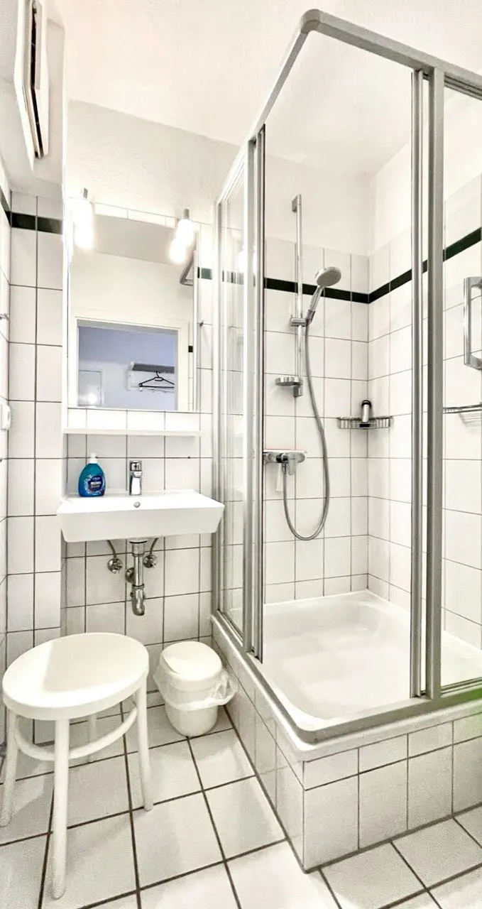 Das Bad verfügt über einen Waschtisch, eine Dusche und WC.