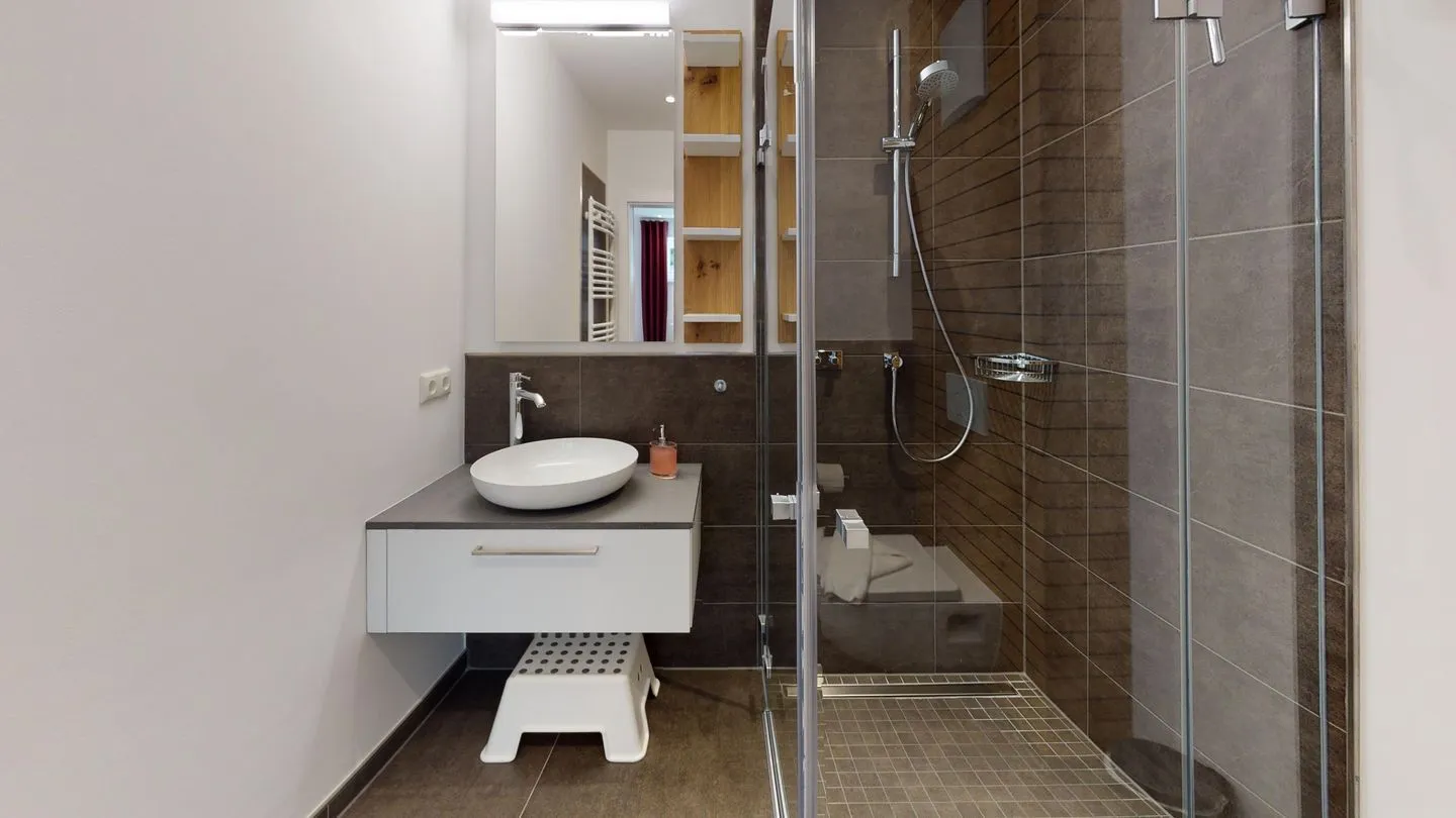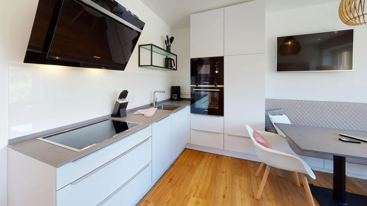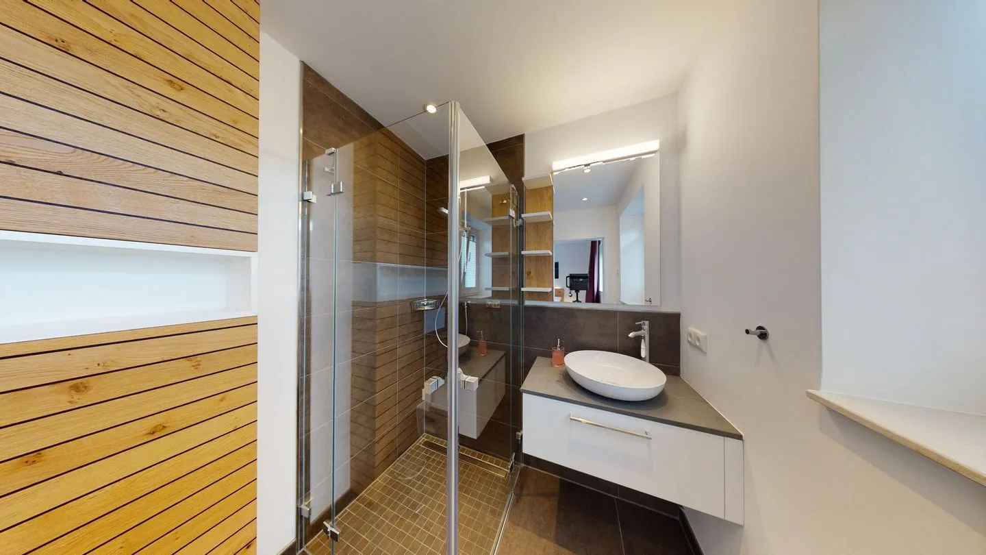 Die Wohnung verfügt über einen einladenden offenen Wohnbereich mit Terrassenzugang, Kaminofen und Essbereich. Die voll ausgestattete Einbauküche ist in den Wohnbereich integriert. Es gibt zwei Schlafzimmer, die direkten Zugang zu jeweils einem modernen Badezimmer mit großer Dusche bieten. Ein zusätzliches Gäste-WC sowie ein Abstellraum ergänzen die Annehmlichkeiten.