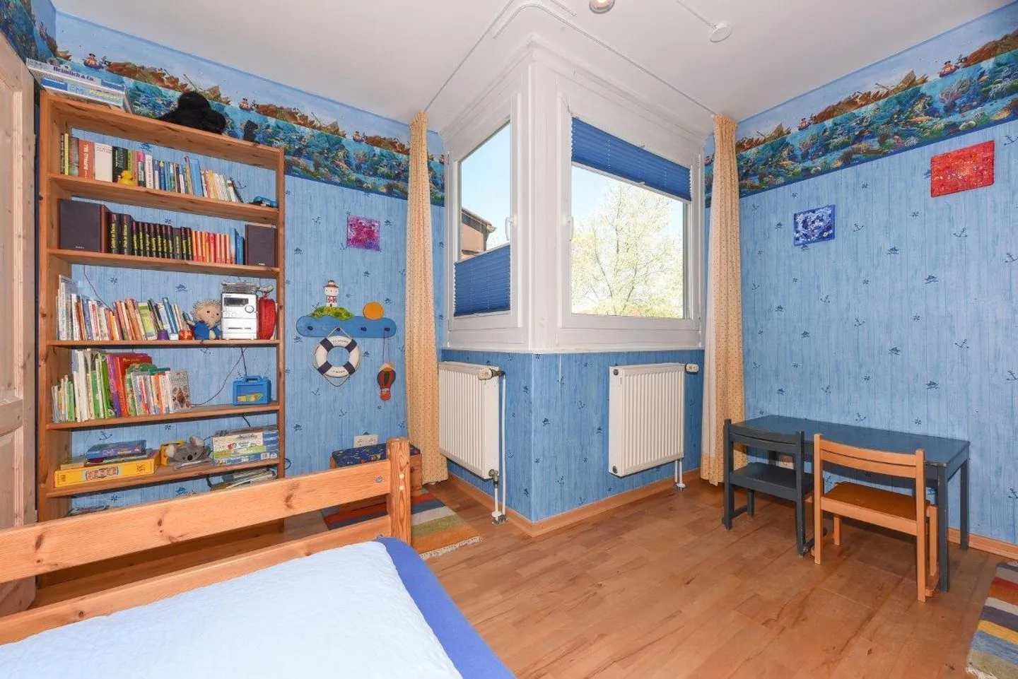 Die mit Massivholzmöbel im maritimen Landhausstil liebevoll gestalteten Räume des Hauses überzeugen durch eine durchdachte Raumaufteilung. Der großzügige Wohnbereich ist mit Echtholzparkett ausgestattet und die bodentiefen Panoramafenster sorgen für eine luftige, lichtdurchflutete Atmosphäre. Im Wohnzimmer ist ein Essbereich integriert, welcher ausreichend Platz für gemeinsame Mahlzeiten bietet. Vom Wohnzimmer aus haben Sie direkten Zugang zur circa 25 m² großen Terrasse auf der Südseite des Hauses – perfekt für sonnige Stunden im Freien. Zusätzlich gelangen Sie hier zum circa 40 m²großen Garten sowie einer großen Spielwiese vor dem Haus.