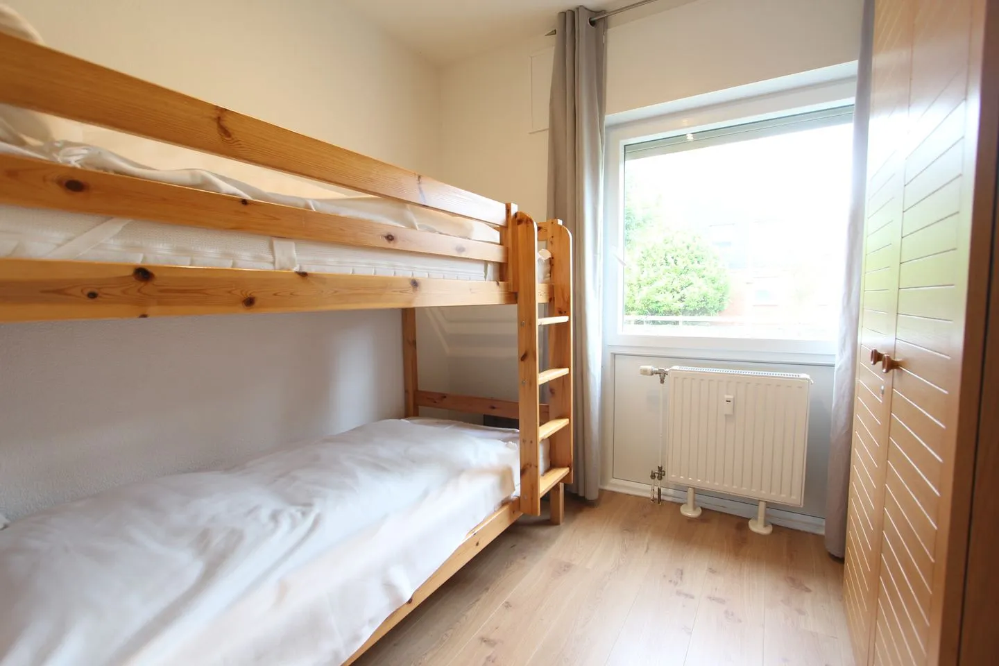 ein weiteres Schlafzimmer mit einem Etagenbett. Das moderne Badezimmer verfügt über eine Dusche und WC.